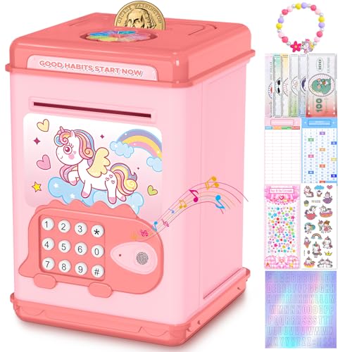 TCJJ Enhörning spargris för barn, sparbössa för flicka med lösenord och fingeravtryck upplåsning, 4 klistermärken och enhörningsarmband och redovisningsblad, flickor enhörningsgåvor till födelsedag,