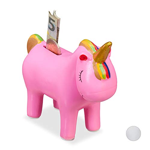 Relaxdays Sparbössa enhörning, keramik, drömmande enhörning, regnbågssvett, dekoration & gåva, enhörningsparbössa, rosa, H ca 15 x 17 x 6 cm