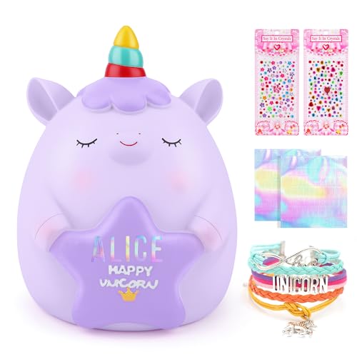 TCJJ spargris för barn, enhörning sparbössa för flickor, sparbössa för barn 2 alfabet och 2 strass klistermärken & enhörning armband set, flickor enhörning gåvor till födelsedag, jul