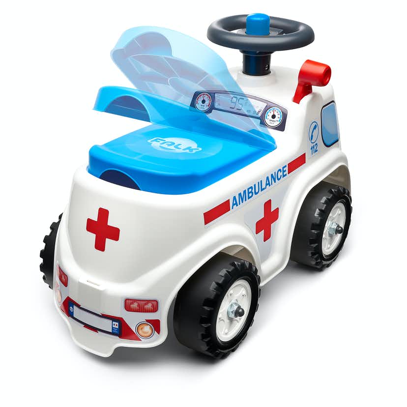 Sparkbil FALK Ambulance ride-on med förvaringsutrymme, ratt och tuta