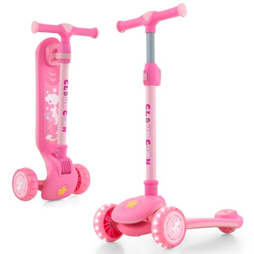 COSTWAY Barnskoter, vikbar, barnskoter med PU LED-hjul och bakbroms, sparkcykel, höjdjusterbar, stadsskoter, sparkcykel för pojkar och flickor från 3 år (rosa)