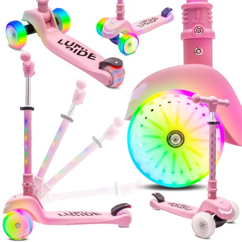 LUMI RIDE Sparkcykel Barn 3 hjul, trehjuling skoter 3+ Rosa, Balans, LED, Hopfällbar, Justerbart Styre, Fotbroms, Halkfri Plattform, Avtagbart Styre