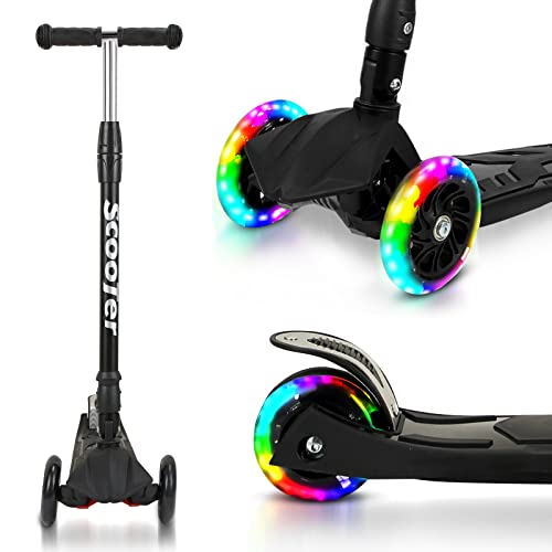 Hurtle Barnskoter, 3-hjulsskoter, vikbar skoter med justerbar höjd, halkfri plattform, LED-upplysta hjul, sparkcykel för flickor/pojkar från 2 till 12 år, svart