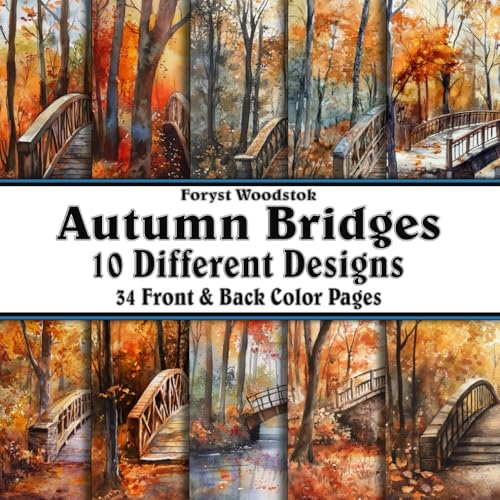 Scrapbook Paper - 34 Front and Back Full Color Sheets: Autumn Bridges - Fall Leaves Sparkling Water Pathways - 8.5"x8.5"