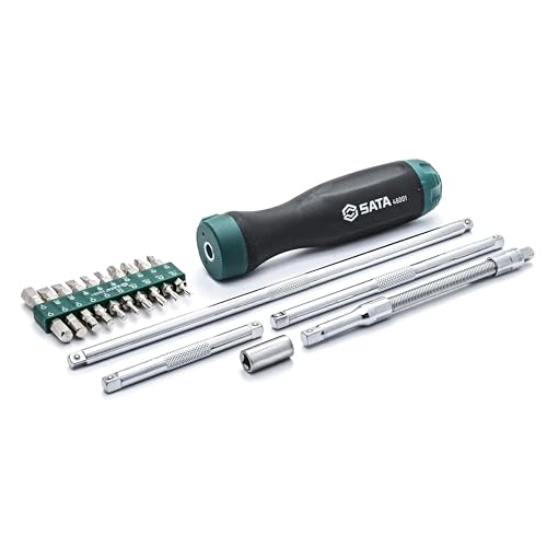 SATA ST09350 19-i-1 mångsidig spärrskruvmejsel set med 8 dubbelsidiga bitar och ett grönt och gult oljebeständigt handtag