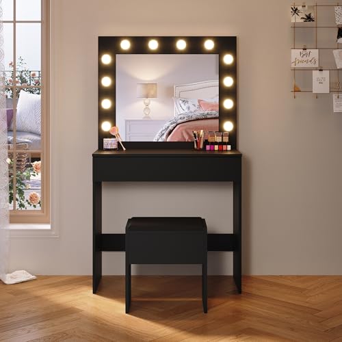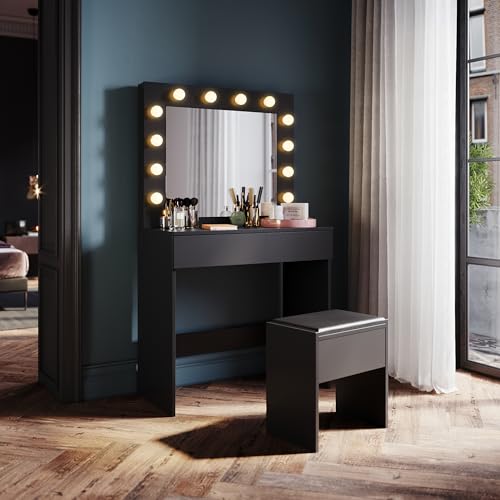SONNI Sminkbord med pall, upplyst spegel, lådor, sminkbord med 12 lampor, 3 färger, 10 justerbar ljusstyrka, toalettbord för sovrum, svart, 80 x 40 x 140 cm.