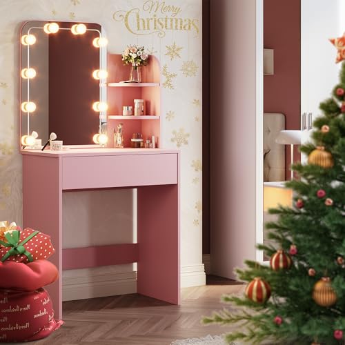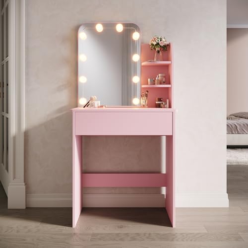 SONNI Sminkbord, toalettbord, sminkbord, med LED-belysning, spegel, en låda och 3 öppna fack, 10 lampor, 3 färger, 10 justerbar ljusstyrka för make-up, rosa, 70 x 40 x 140 cm