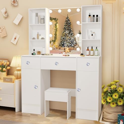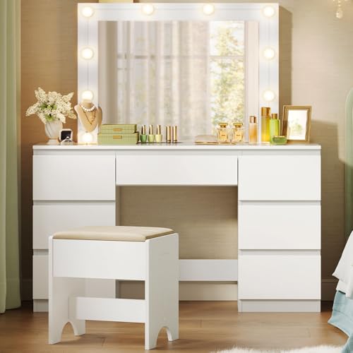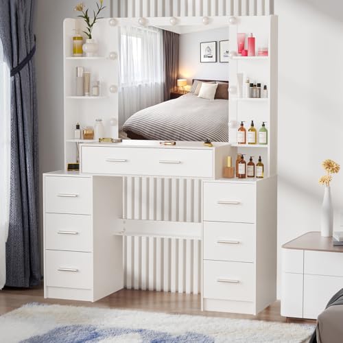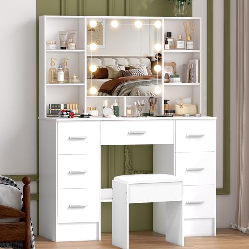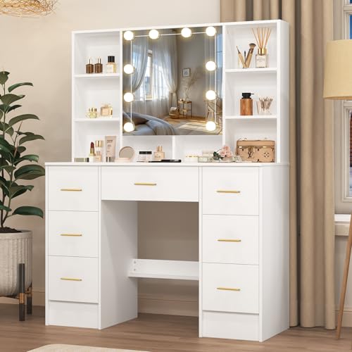 Buildonely Sminkbord med spegel och belysning, justerbar ljusstyrka, sminkbord med 4 hyllor, toalettbord med 7 lådor, 1 pall, modernt, vitt, 40 x 100 x 140 cm