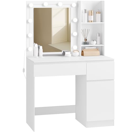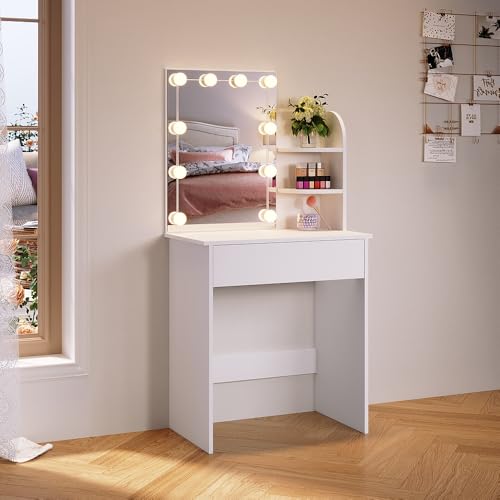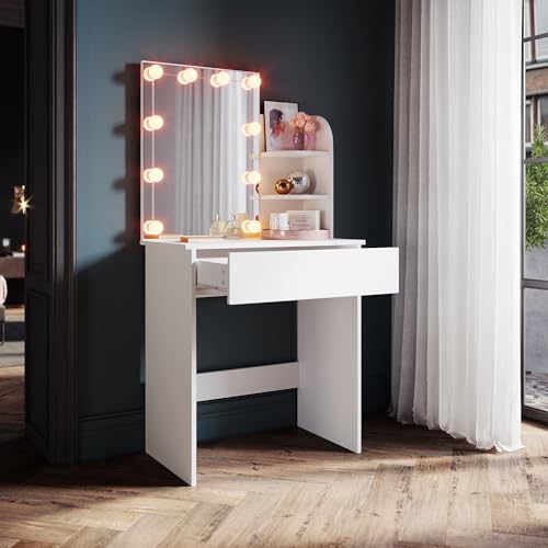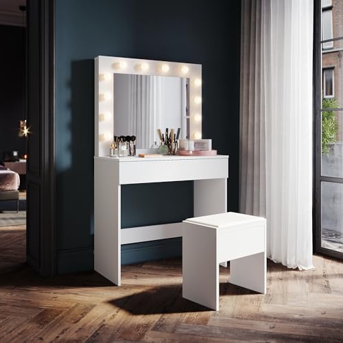 SONNI Sminkbord med pall, belysning, spegel, lådor, sminkbord med 12 lampor, 10 justerbar ljusstyrka, 3 färger, toalettbord för kvinnor sovrum, vitt, 80 x 40 x 140 cm.