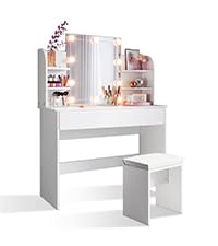 SONNI Sminkbord med pall och LED-belysning, vit byrå med Hollywood-spegellampa, spegel, toalettbord, 108 x 40 x 140 cm
