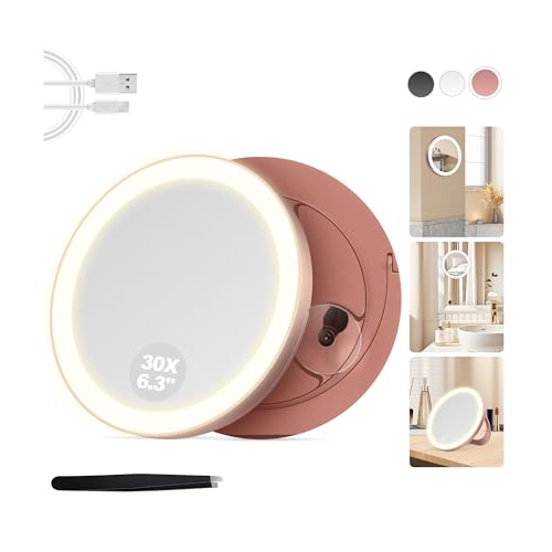 MOMOKUBA Förstoringsspegel med belysning, 30 x spegel med sugkopp, ljusa och dimbara färger, för precisionssmink, vägg- eller bordsspegel, för badrum, roséguld