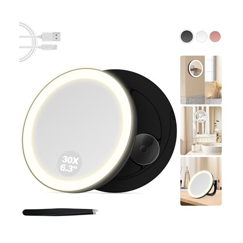 MOMOKUBA Förstoringsspegel med belysning, 30 x spegel med sugkopp, ljusa och dimbara färger, för precisionssmink, vägg- eller bordsspegel, för badrum, svart