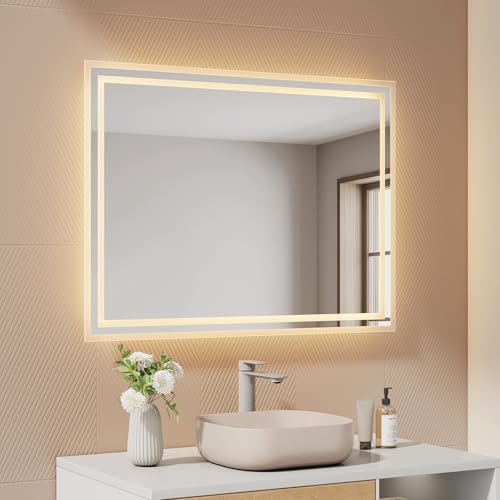 BestAlice Badrumsspegelskåp, badrumsskåp med spegel och ljus, spegelskåp med dubbla dörrar, badrum med belysning, väggskåp, dimbar 3 färgtemperaturer, touchströmbrytare (80 x 60 cm)