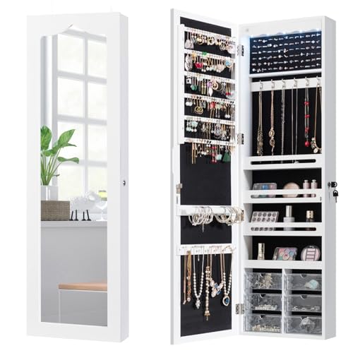 GOPLUS Smyckesskåp med spegel, väggmonterbart låsbart smyckesskåp med 5 LED-lampor, 4 förvaringshyllor, 120 örhängesfack, 18 krokar, 84 ringslitsar och 6 lådor (vit)