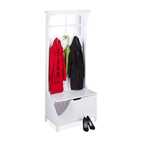 Relaxdays Klädhängare bondgård, med spegel, bänk och förvaring, 5 krokar, entré mantelstativ, HWD 186 x 81 x 44,5 cm, vit, 1-pack