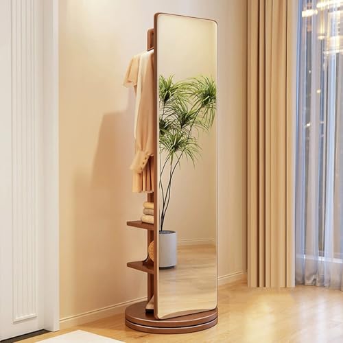 Spegel i full längd med klädställ, 360° roterande massivt trä, stor helkroppsspegel med hängande krokar, 2-i-1 fristående golvspegel klädhängare för vardagsrum, sovrum (valnötfärg)