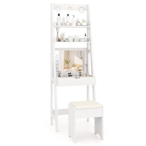 COSTWAY 3-i-1 sminkbord och steghylla och skrivbord med hopfällbar spegel och 3 krokar, toalettbord med 2 hyllor och 6 fack, sminkbord med pall, sminkbord vitt, 40 x 60 x 180 cm