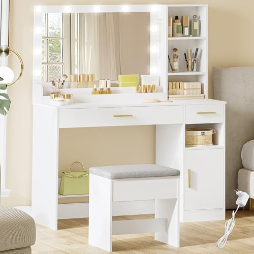 HEXCELEN Sminkbord med Pall, Sminkbord med Stor Led-spegel, 11 Led-lampor med Justerbar Ljusstyrka, Sminkbord, 2 Lådor, 4 Fack och 1 Skåp, 40 x 108 x 141 cm Vit