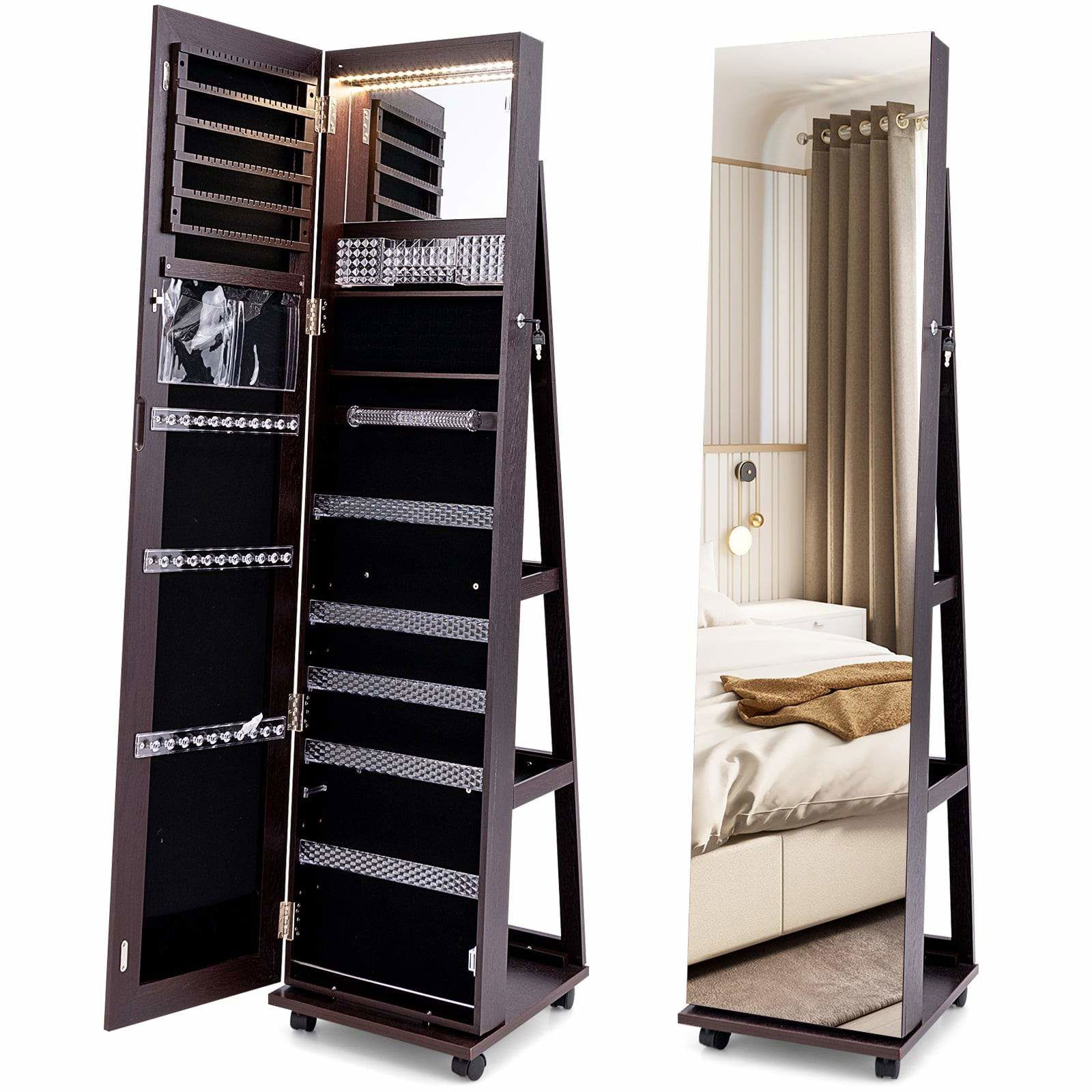 Låsbart smyckesskåp med spegel och LED-lampor – mörkbrun