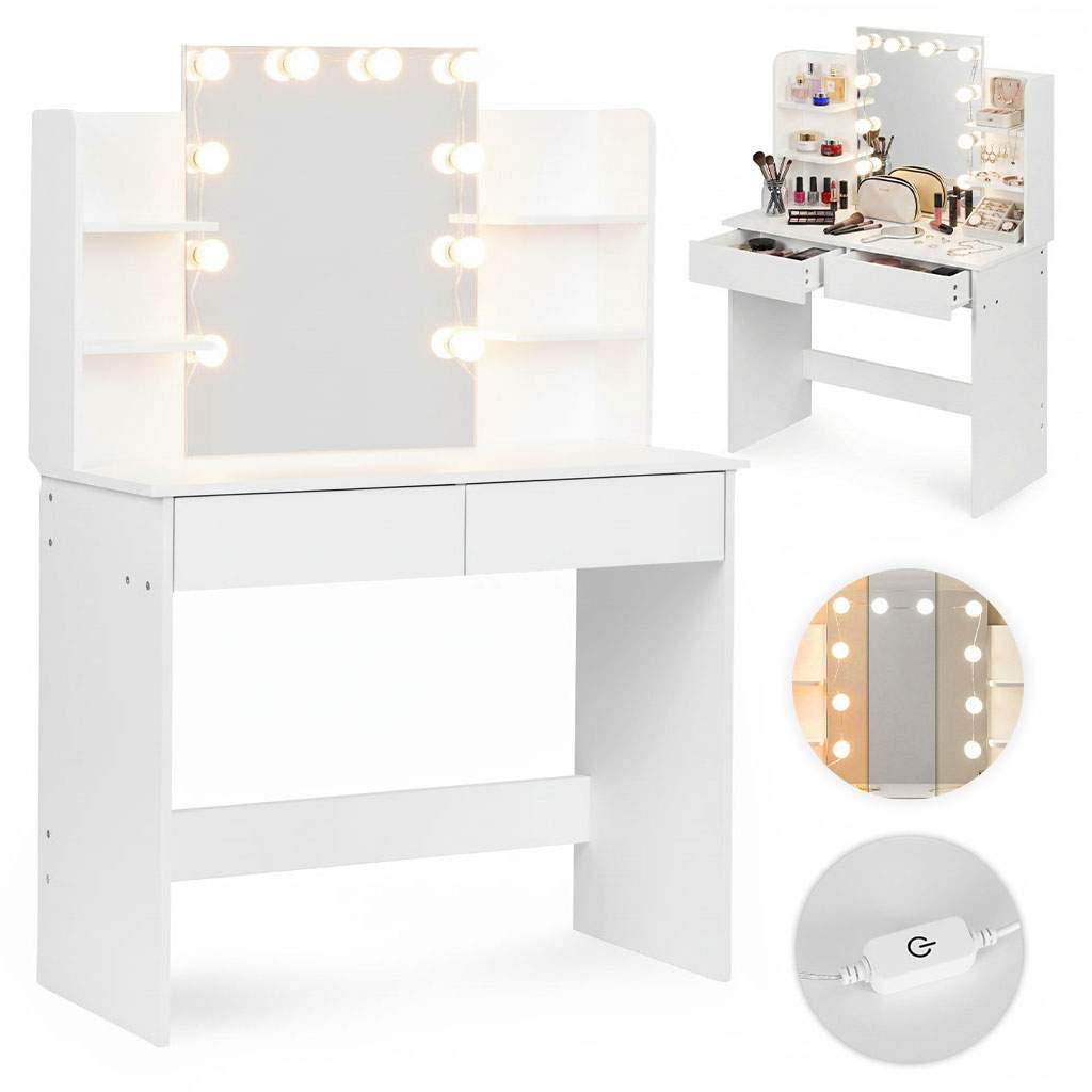 Vitt sminkbord med spegel, 10 LED-lampor, 7 lådor