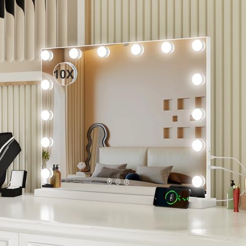 LuxeVue Skötbordsspegel med ljus, upplyst sminkspegel med smart touchkontroll, 3 färger, 9 dimbara glödlampor, Hollywood-spegel med avtagbara lampor, 15 x förstoring,