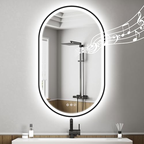 STARLEAD Svart spegel badrum oval med ljus och Bluetooth 100 x 60 cm, LED-badrumsspegel med anti-dimma, justerbar, 3 färger ljus, minne, IP44, härdat glas, horisontell/vertikal, icke-metallisk ram