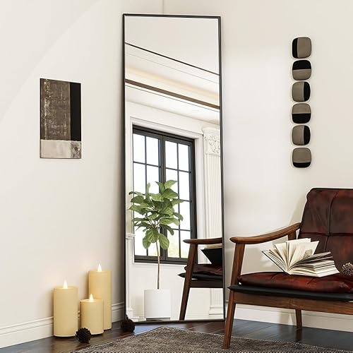 Koonmi 144 x 45 cm stående spegel, minimalistisk ram, solid fristående helkroppsspegel, lätt spegel i full längd, hängande på väggen, horisontellt eller vertikalt för sovrum, svart