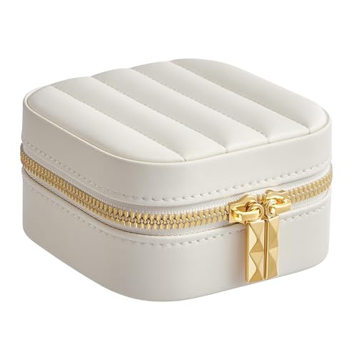 SONGMICS HOME ANAH Collection - Resesmyckeskrin, liten smyckeförvaring med spegel, 10,5 x 10,5 x 6 cm, PU med sömmar, dragkedja, presentidé, molnvit JBC179W01