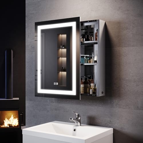 SONNI LED-spegelskåp med belysning 50 × 70 cm aluminium imfri trådlös gångjärnsdesign, badrumsskåp med spegel och uttag för badrum IP44 vattentät