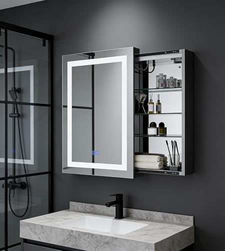 SONNI Spegelskåp badrum spegelskåp med belysning 50 × 70 cm dimfritt badrumsskåp med spegel med touch och uttag spegelskåp för badrum aluminium