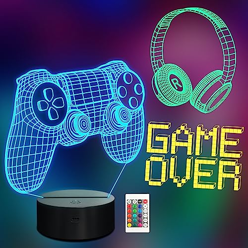 Ammonite Game Over 3D-lampa, spelkontroll hörlurar 3D-nattlampa (3 mönster) med fjärrkontroll 16 färgbyten pojkar videospelare rum dekor som jul födelsedagspresenter för tonåringar män spel