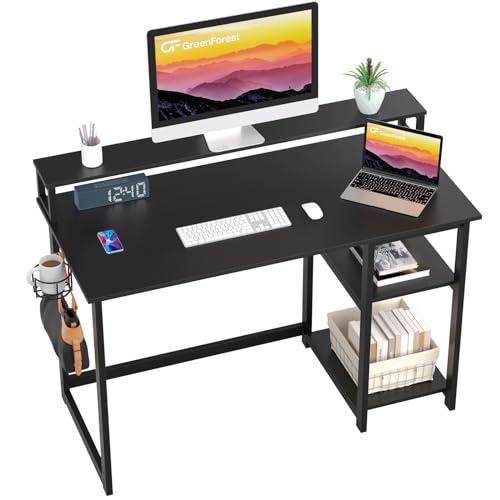 GreenForest dator skrivbord med full bildskärm stativ och vändbara förvaringshyllor, 120 x 55 cm dator kontorsbord med hörlurar krok och koppkrokar, spel arbetsstation bord, svart