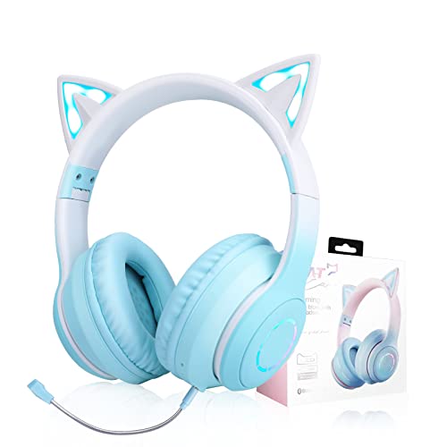 JYPS Trådlösa hörlurar, barnhörlurar med LED-ljus och kattöra för flickor, Bluetooth-headset med avtagbar brusreducerande mikrofon och inbyggd mikrofon för samtal/spel (lila)