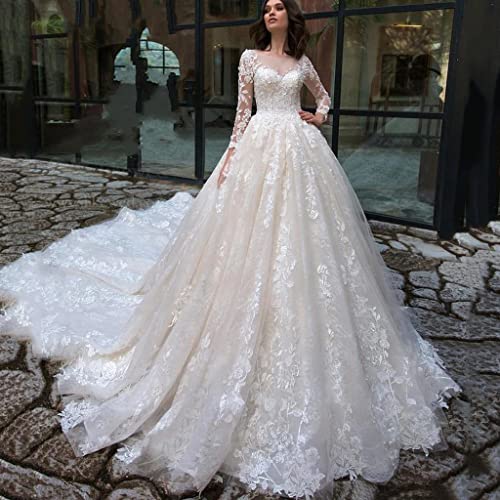 CongMing-huajia brudklänningar lång svans spets broderad långärmad, fransk spets bröllopsklänningar dam personlig plusstorlek aftonklänningar vit