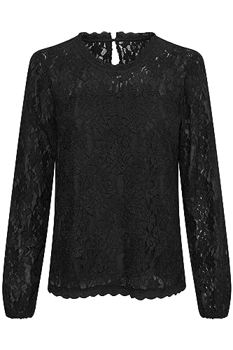 Cream Dam blus spets topp långärmad rund hals scallop kant vanlig passform dam, Pitch Black, XL