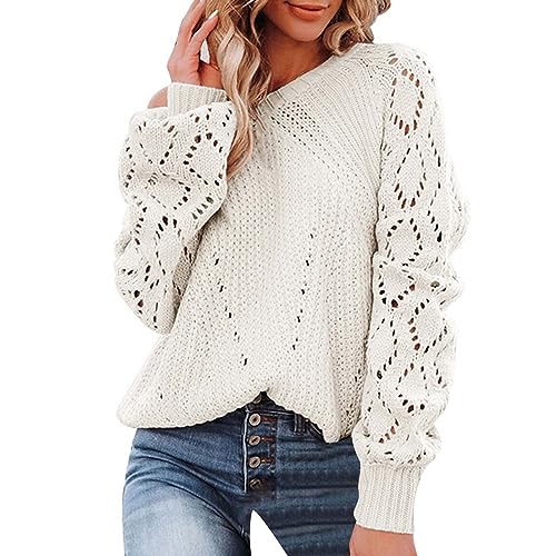 2025 Mode tröja toppar för kvinnor pullover kvinnor rund hals virkad spets långärmad ihålig kabel stickad pullover tröjor toppar fjärdedel dragkedja tröja kvinnor, Vitt, M