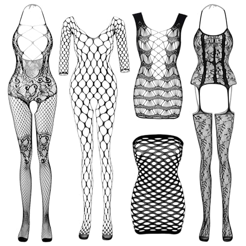 Dam fisknät bodys underkläder nattkläder spets strumpor blommor för romantiska datum bär sexiga underkläder (5-pack), svart, Einheitsgröße