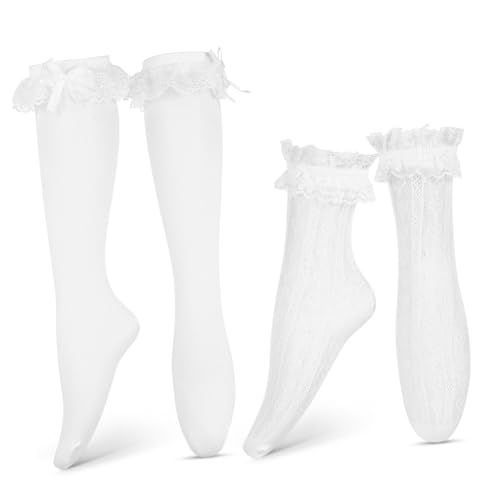 VALICLUD 2par Långa Strumpor Med Bows Och Ruffle Spets Vita Strumpor För Dam Perfekta För Oktoberfest Och Dirndl Kläder Bekväma Och Elastiska Med Delikat Spetsdetalj