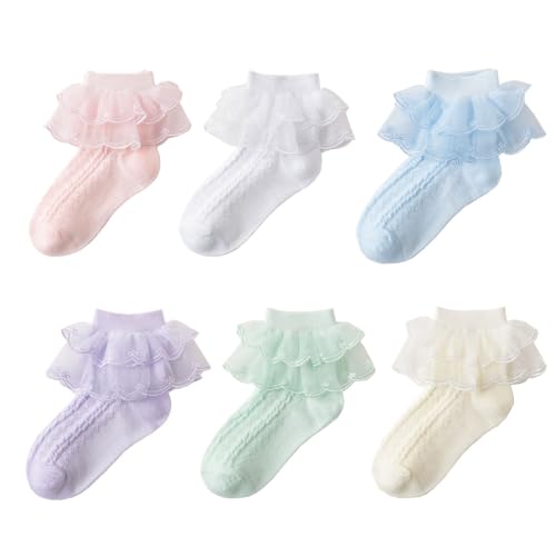 HXQLXGT 6 Par Baby Flickor Krusig Spets Strumpor Liten Flicka Ankelstrumpor Barn Balett Volang Skolstrumpor 1-9T, 6 par flerfärgade, 4-7 Years