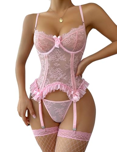 Aranmei Damunderklädesset sexig spets bodysuit med strumpor blommig spets strumpeband underkläder underkläder kläder nalle babydollar med höga lår, rosa, M