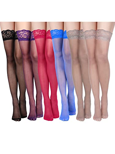 6 par lårhöga strumpor spets tights silkeslena halvtunna strumpor för kvinnor flickor, Svart, lila, kaffe, kungsblå, grå, lila röd, M