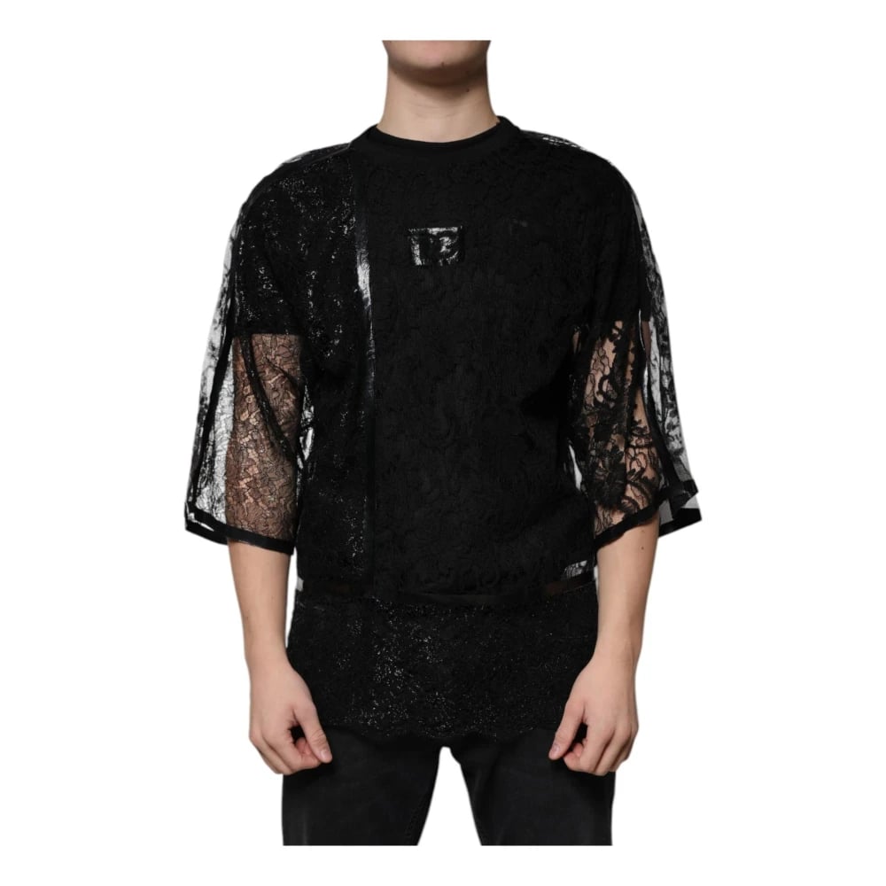 Dolce & Gabbana, Toppar , Herr, L, Bomull, Svart Spets Crew Neck T-shirt med Logotyp