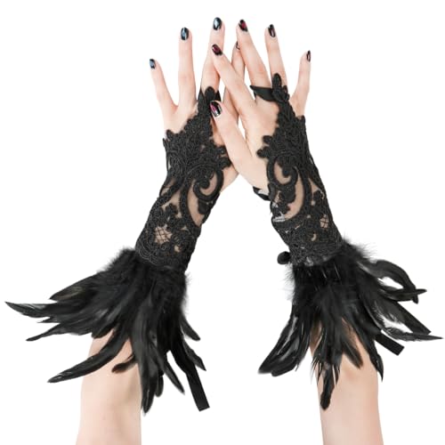 Aurasky Spetshandskar med fjädrar, svart, lång damspets, 20-tal, fingerlös, för bröllop, halloween, karneval, cosplay fest