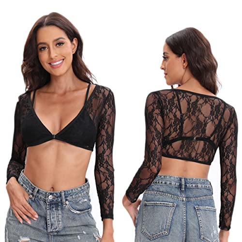 Buliezy Spets magtröja kvinnor spetsunderkläder bantning bodysuit blus toppar 3/4 ärm sommar djup V öppen framsida elasticitet täckning (stor) svart, Svart, L