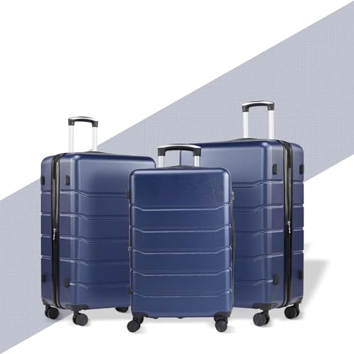 Kono Bagageset lätt ABS hårt skal vagn resväska med TSA-kombinationslås och 4 spinnhjul 20 tum 24 tum 28 tum resväska 2 års garanti hållbar, Marinblått Xsp, 3 Pcs Set, Bagageset