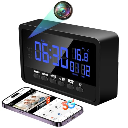 Nisanmoon WiFi-väckarklocka dold kamera HD 1080P dold spion med väckarklocka, mini wifi spionkamera 2,4/5 GHz stöd nattseende och rörelsedetektering, app fjärrövervakning
