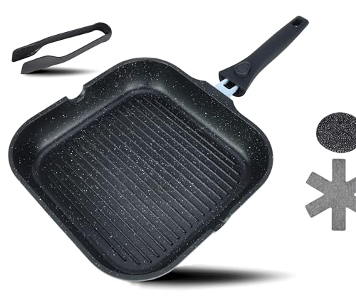 DIVORY Grillpanna 28 x 28 cm med hällpip och avtagbart handtag - induktionspanna - belagd grillpanna inklusive grilltång och spisskydd Svart