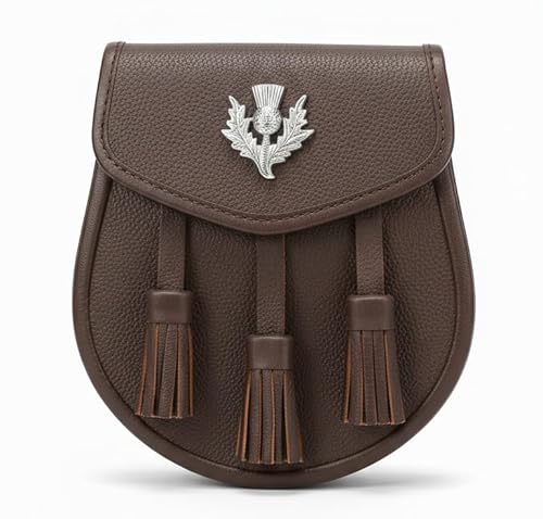 FITWORTH 100 % äkta läder brun sporran med tistel och 3 tofsar | Elegant, snygg skotsk kiltsporran med kedjebälte, Brun, Adjustable, fitting waist sizes from 28 to 48 inches