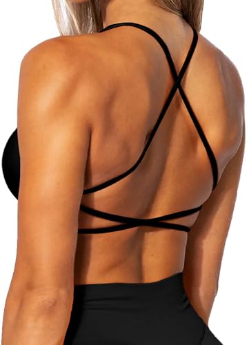Aoxjox sport-BH, träning, vadderad rygglös yoga crop top, twist-back cami., 1 svart, XS