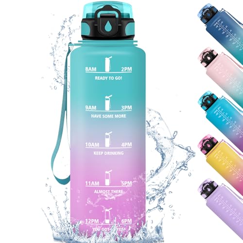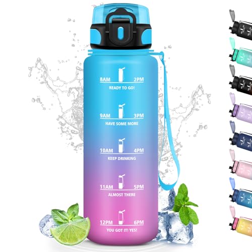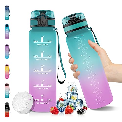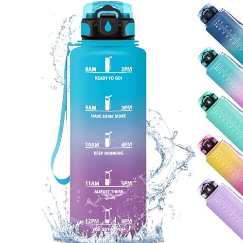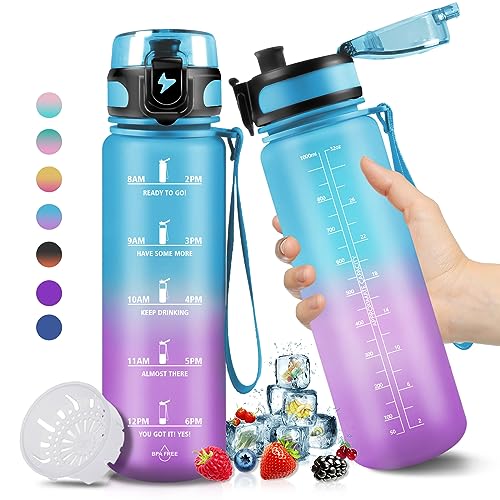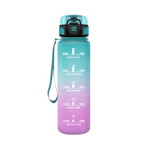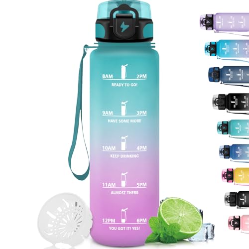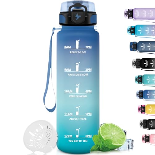 Grsta 1 liter vattenflaska, läckagefri, motiverande vattenflaska med filter, vandringsflaska med motiverande slogan, vattenflaska för sport, vandring, cykling, blågrön
